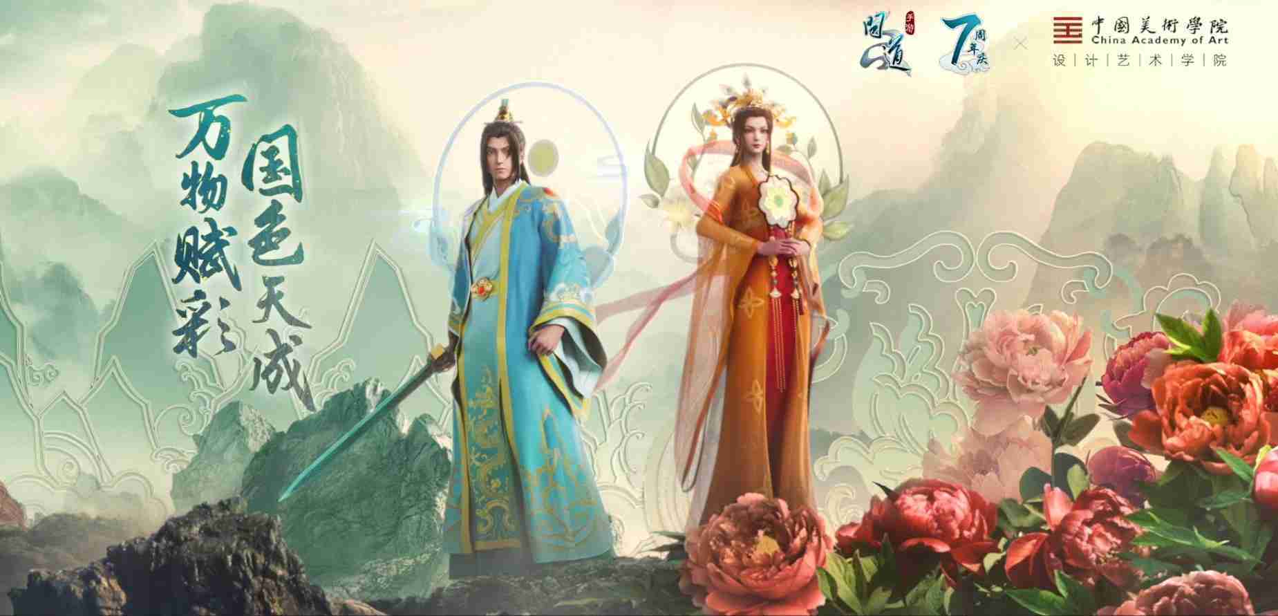 2023年4月,,《问道手游》联动中国美术学院,,,在游戏中融合了中国历史上不同时期的文化元素,,打造了“山河万象”与“凤鸣九霄”的国风时装。。。。在色彩配置方面,,,创作团队基于对游戏角色特性的分析提取相应的文化内涵,,从每一种色彩的色相、、指代事物和情感出发对应角色属性,,选定服装的色彩搭配。。。。在纹样设计方面,,,创作团队结合游戏角色自身特殊的造型比例和形态,,在实际的纹样设计中进行了游戏语境下的活化演绎。。。男性角色集中使用了如蟒纹、、海水江崖纹、、、、如意纹和云气纹等传统纹样元素,,,,女性角色则吸纳了凤凰纹、、牡丹纹、、、卷草缠枝纹等元素,,组成以“双凤牡丹纹样”“缠枝牡丹纹”“金玉凤冠头饰”为主要纹样的游戏角色装饰图案系统。。。