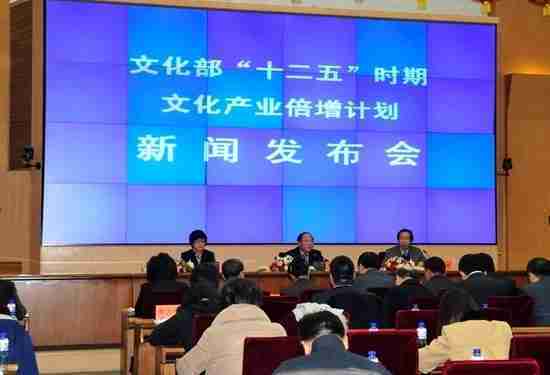 2月28日下午,,,,文化部在京召开新闻发布会,,,,正式向社会发布《文化部“十二五”时期文化产业倍增计划》,,,提出了 “十二五”期间文化部门管理的文化产业增加值年平均现价增长速度高于20%,,,2015年比2010年至少翻一番,,实现倍增的奋斗目标。。